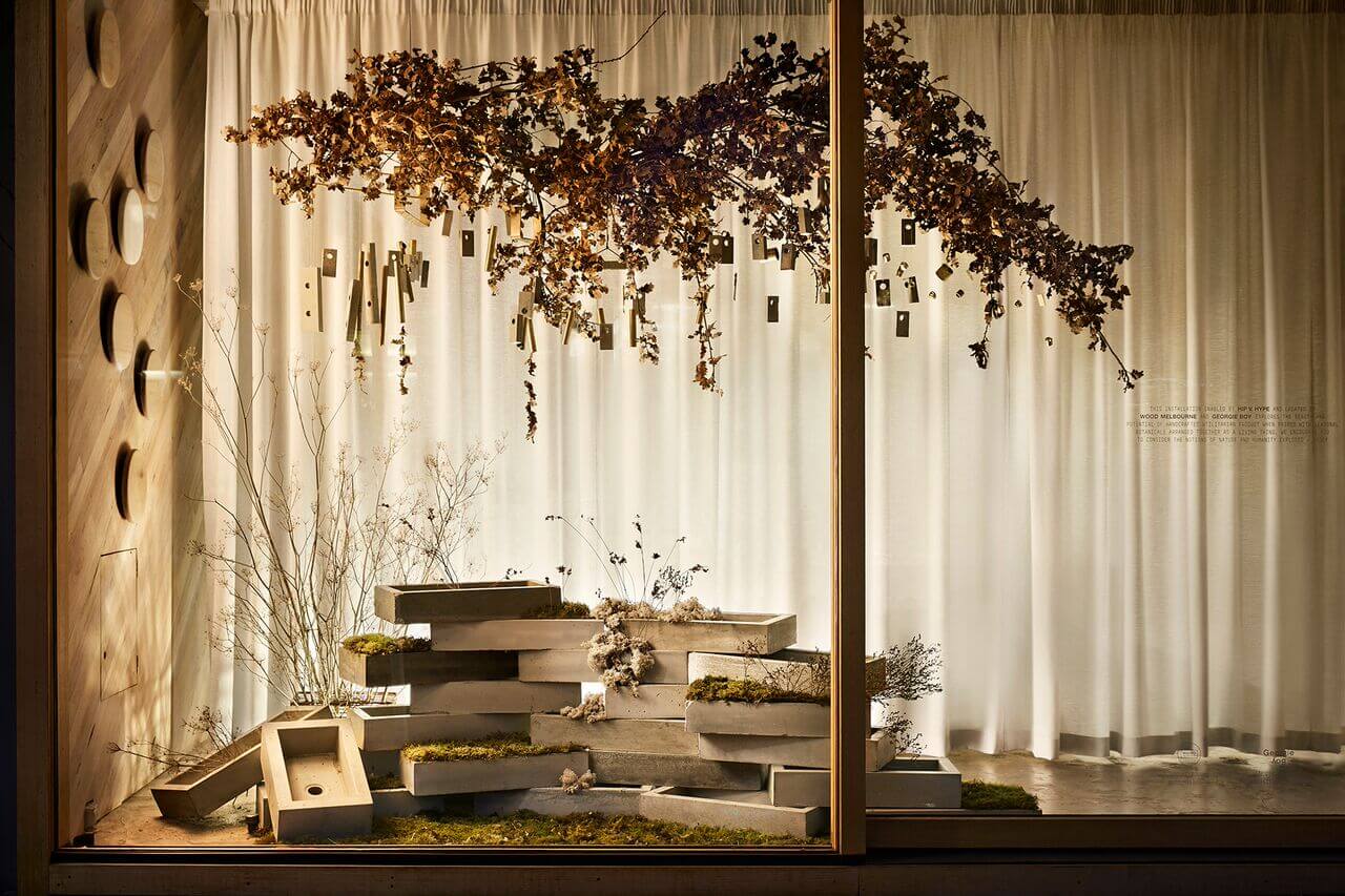 The installation has been conceived to explore the beauty and potential of handcrafted utilitarian product when paired with seasonal botanicals arranged together as a living thing.