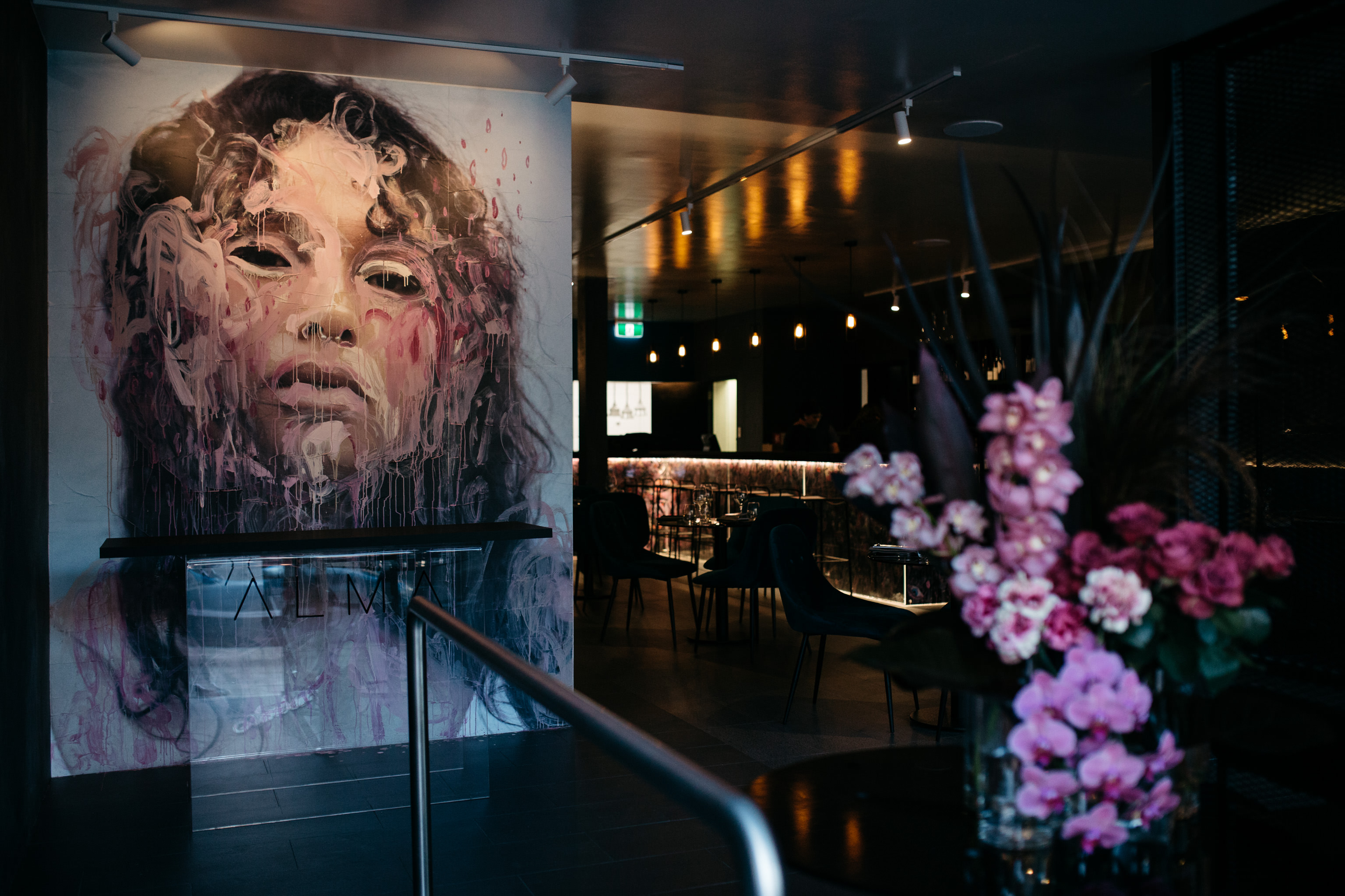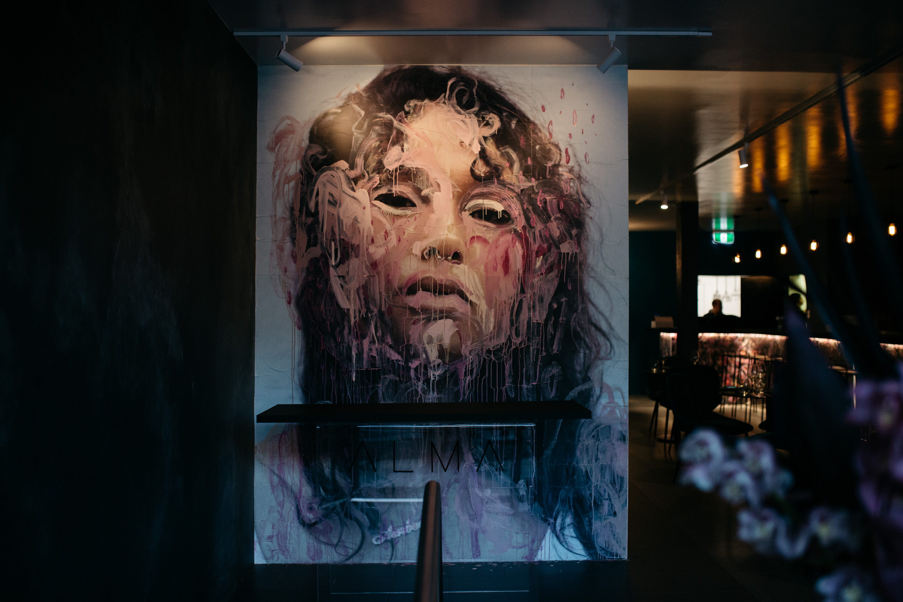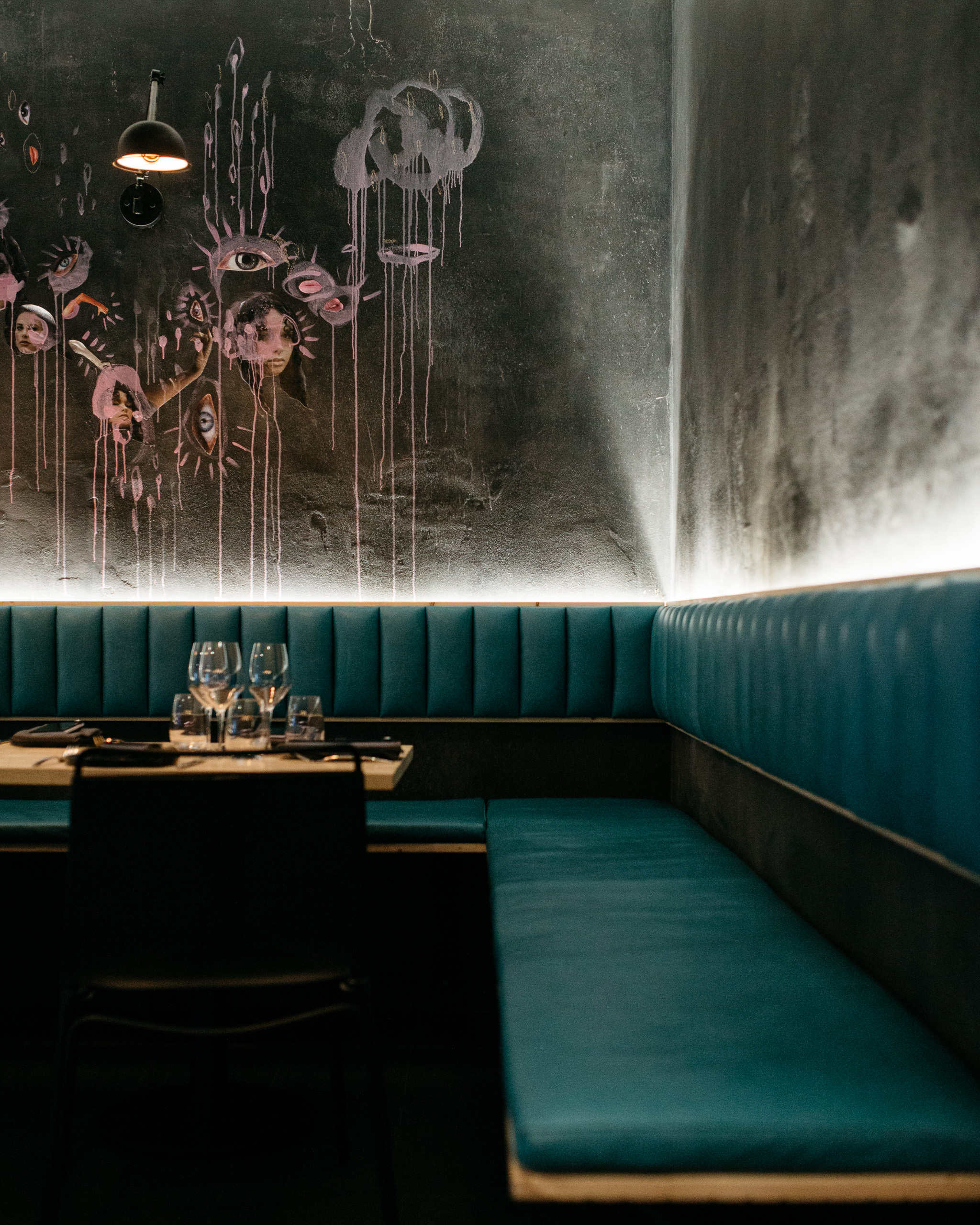 Behind the Perspex desk at the front-of-house stands a floor to ceiling mural created by Cochrane, instantly evoking a lasting impression on diners.
