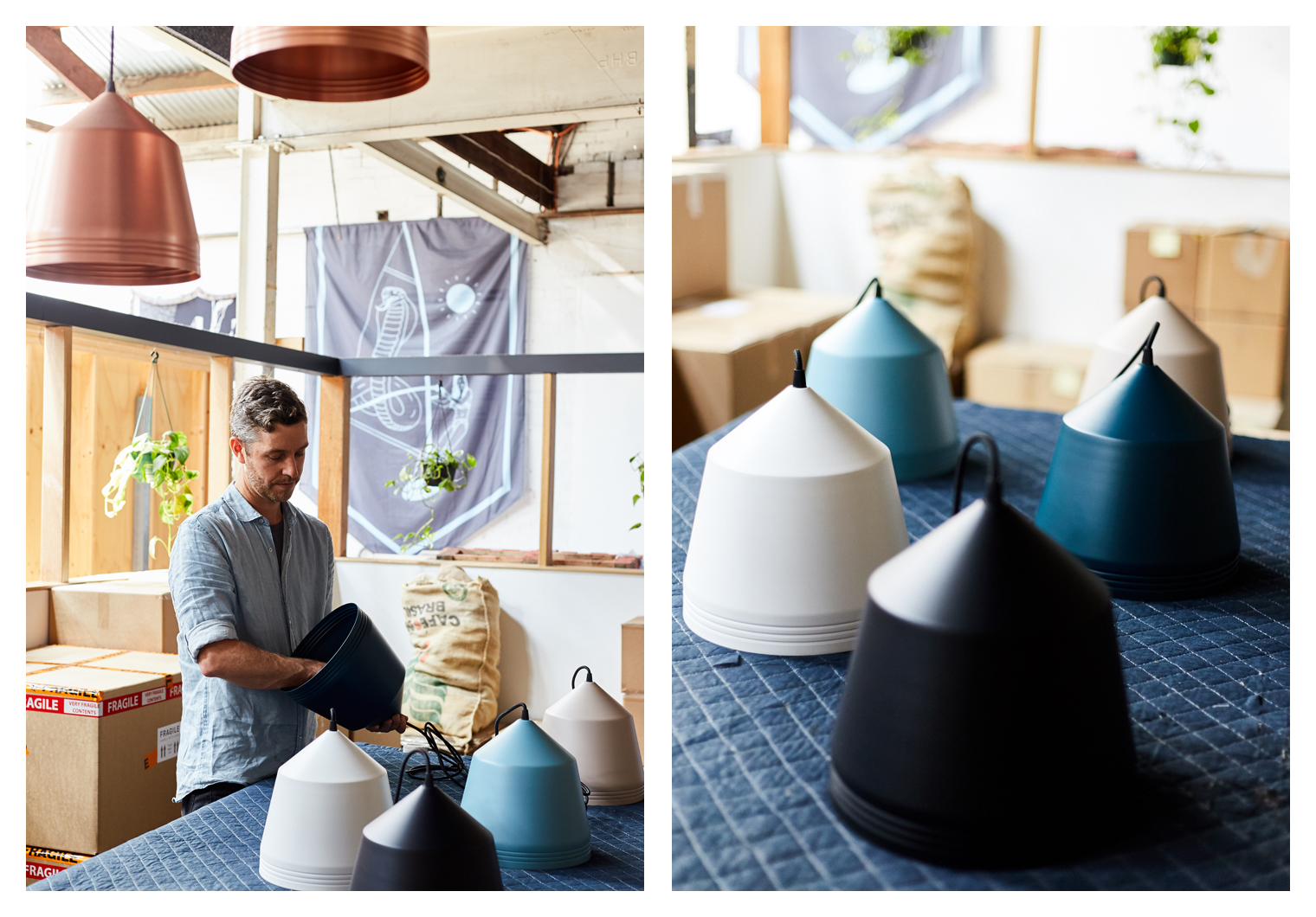 Haslett with a series of Cooper Pendants. The spun-metal pendant pays tribute to the early 20th Century. The pendants come in brass, copper, aluminium and powdercoated.”The best advice I’ve received is to make sure you are enjoying what you are doing. Life’s too short to chase dreams that you don’t enjoy chasing. There will always be times when things are tricky or stressful but the pursuit needs to provide satisfaction and enjoyment – not just the outcomes. Take risks and have conviction in the concepts that you want to pursue. Being bold and adventurous is far more enjoyable and is essential to creating interesting new work. When someone is truly confident in the quality & authenticity of their design it shows and encourages others to help make their vision a reality”. – Haslett Grounds.