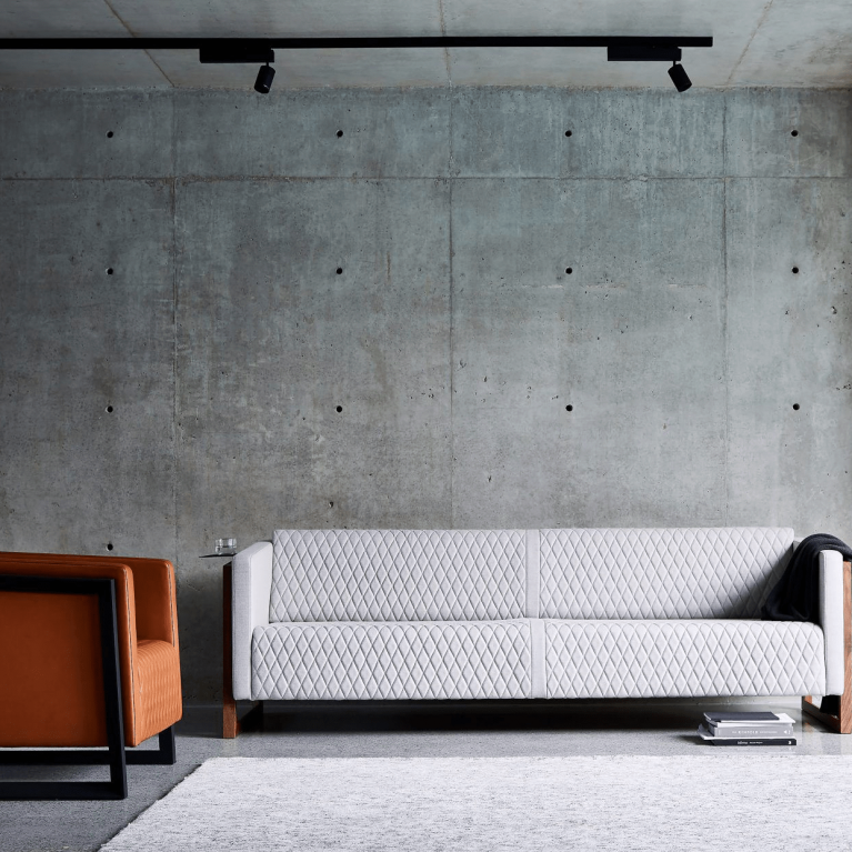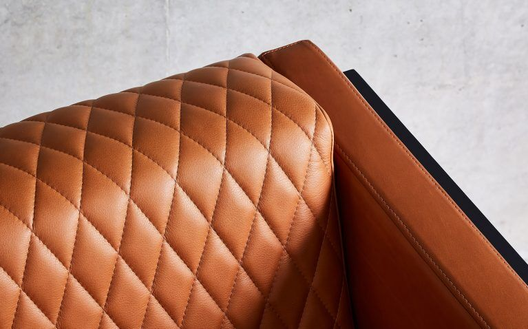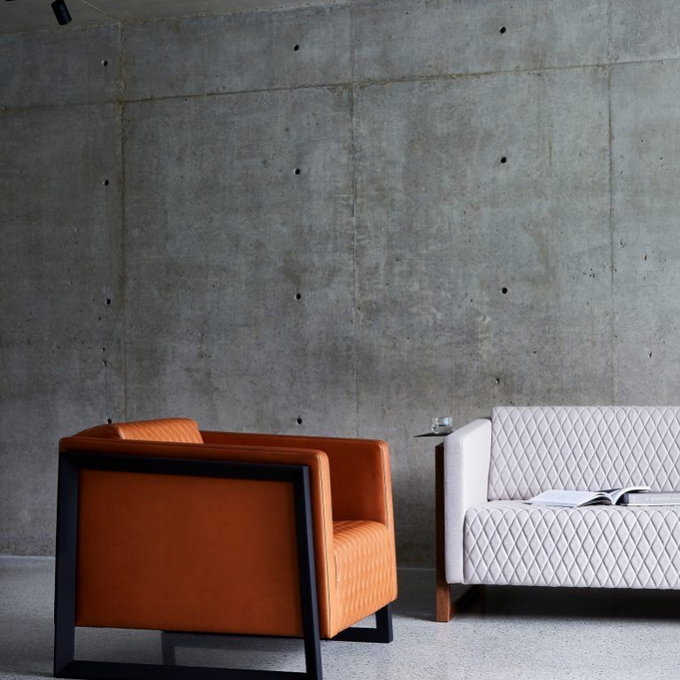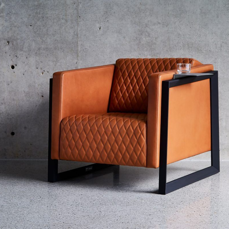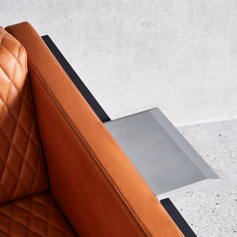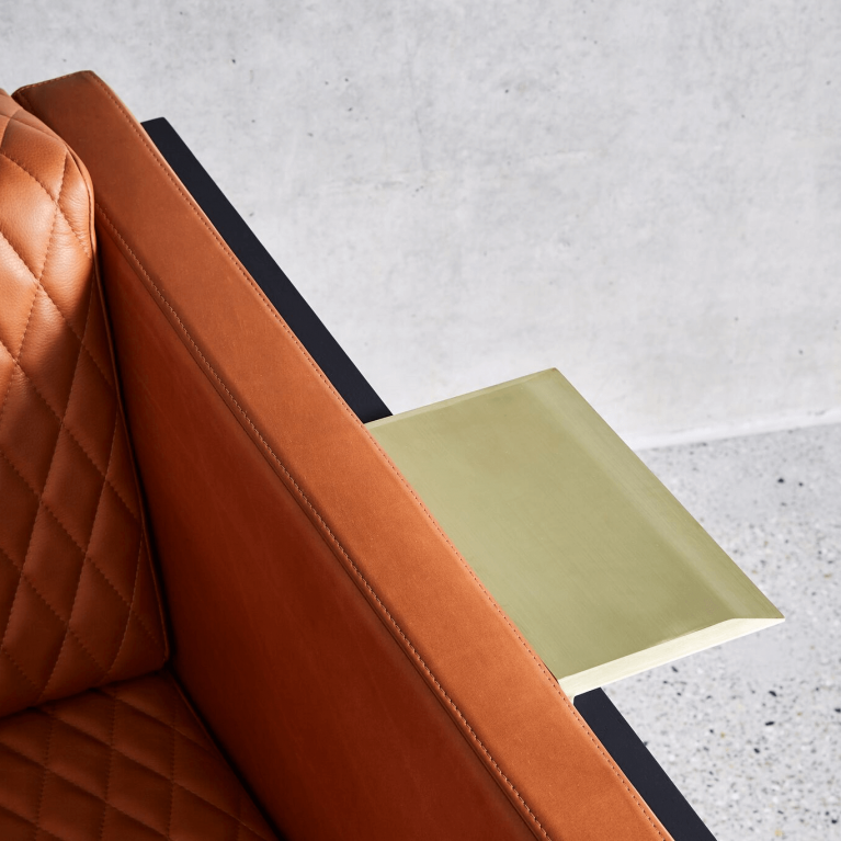Fully-upholstered, the Mena Armchair exhibits its own powerful, connective design language, with strong lines, sharp geometry, diamond hand-stitched quilting, and stunning chamfered profiled timber arms — with the option of a handy, removable, Metal Ledge.