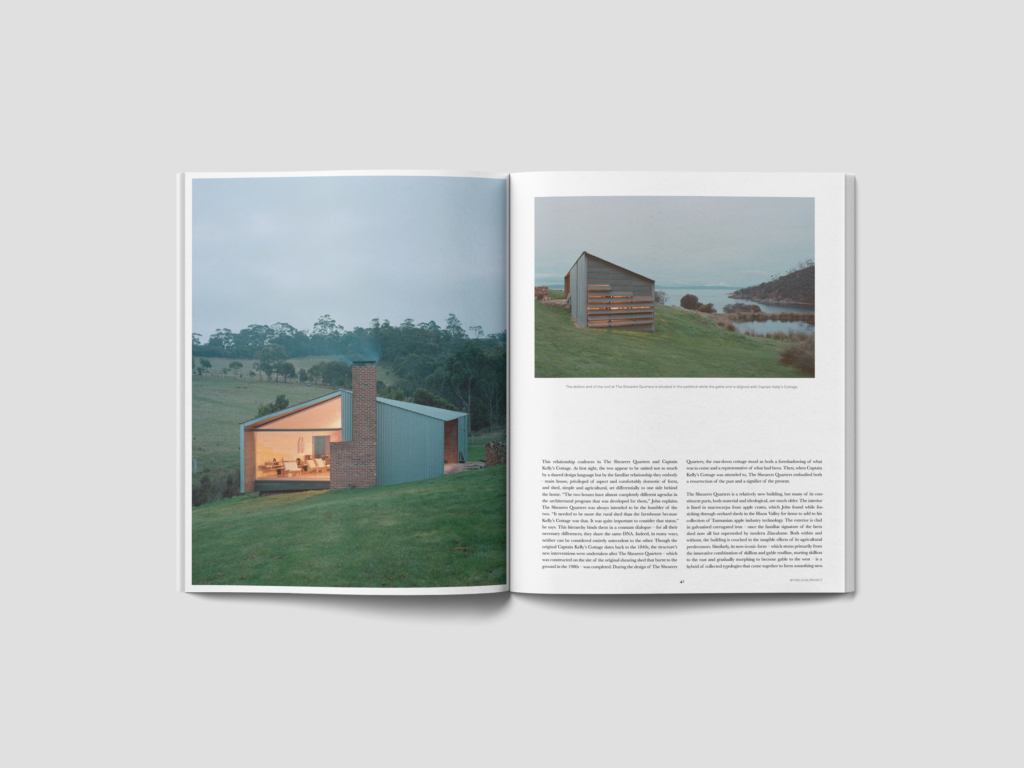 Two buildings companionably occupy a hillside at Waterview, a historic 540-hectare sheep farm on Tasmania’s Bruny Island. Though both were completed within the last decade – The Shearers Quarters in 2012 and Captain Kelly’s Cottage in 2016 – each is superimposed upon traces of what came before, some physically evident and others mere ghosts of memory. The much-lauded work of John Wardle Architects, the buildings embody the intersection of both the site’s layers of history and its contemporary evolution, as over the past 20 years it has been extensively revegetated and become something of a testing ground for the practice.