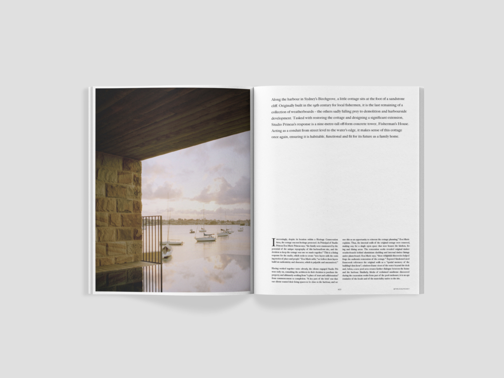 Along the harbour in Sydney’s Birchgrove, a little cottage sits at the foot of a sandstone cliff. Originally built in the 19th century for local fishermen, it is the last remaining of a collection of weatherboards – the others sadly falling prey to demolition and harbourside development. Tasked with restoring the cottage and designing a significant extension, Studio Prineas’s response is a nine-metre-tall off-form concrete tower, Fisherman’s House. Acting as a conduit from street level to the water’s edge, it makes sense of this cottage once again, ensuring it is habitable, functional and fit for its future as a family home.